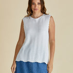 The Aviva Tank is an effortless staple designed for easy everyday wear. Crafted in a textured knit, it features a round neckline and a wavy stripe hemline that adds a subtle statement. Its sleeveless silhouette and relaxed fit make it perfect for layering or wearing solo through the seasons. A transeasonal piece that feels both classic and elevated.