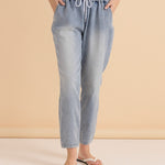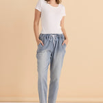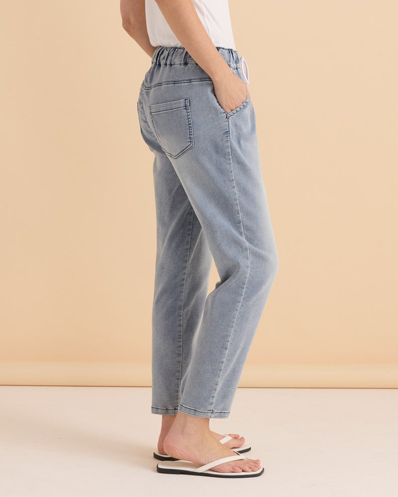 A tapered denim pant designed for everyday comfort. The elastic waistband with drawcord ensures an easy fit. Functional pockets add practicality to a classic style. A comfortable and elevated essential for transeasonal wear.