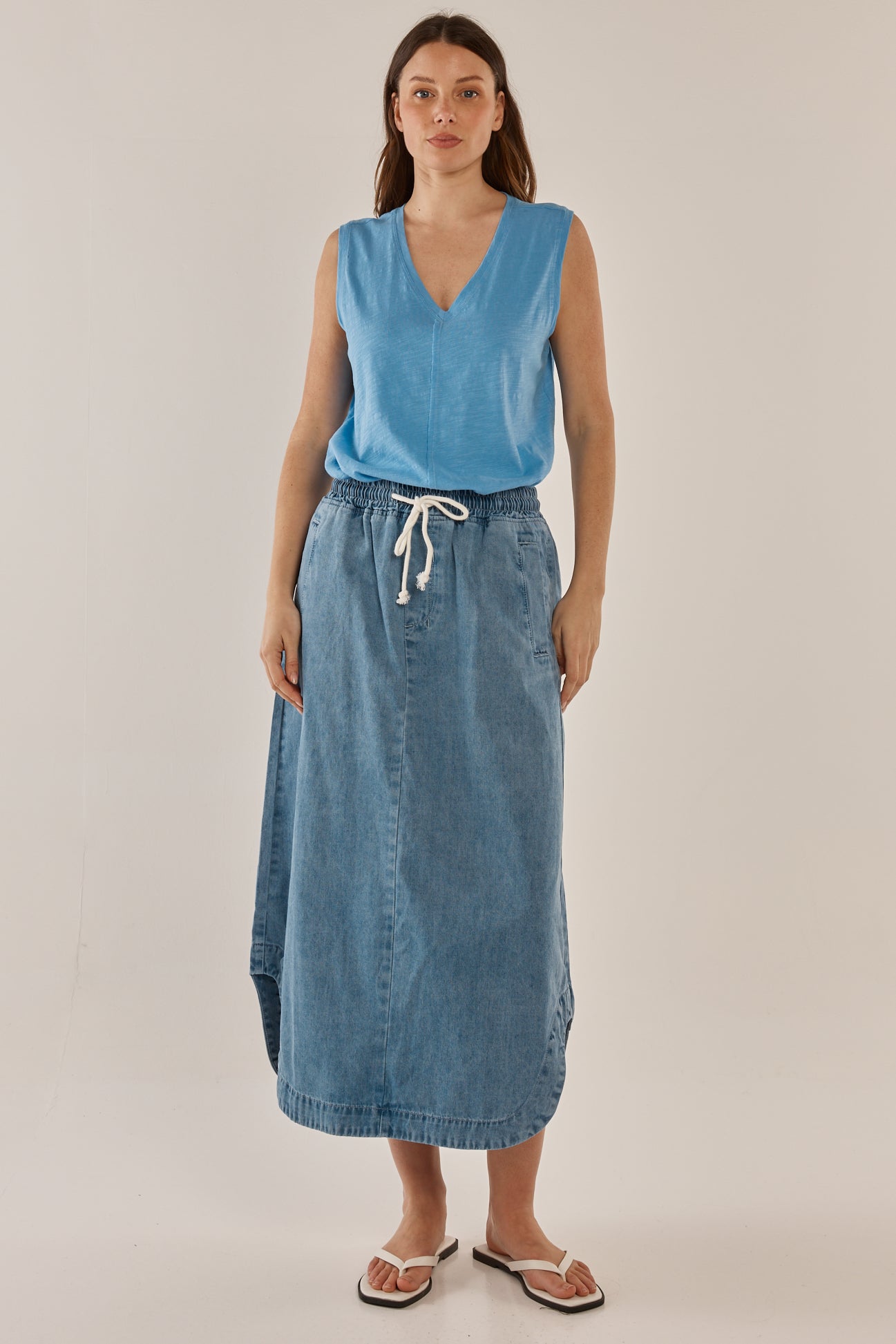 Effortlessly cool and comfortable, the Brunch Denim Skirt is crafted in a classic denim feel with a relaxed fit. Featuring functional pockets and belt loops, it combines easy style with elevated practicality. The timeless front fly zip and button fastening add to its classic appeal. Perfect for transeasonal casual elegance.
