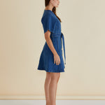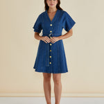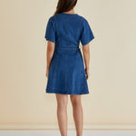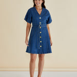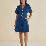 The Fiori Denim Dress is a relaxed fit classic with balloon sleeves and cuff details that elevate its silhouette. Made from soft denim feel fabric, it features a button-up V-neck front and belt for added structure. An easy, comfortable choice perfect for transeasonal styling with a timeless edge.