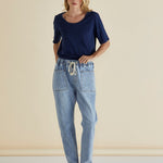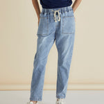 The Haven Straight Leg Jean is designed for comfort and style, featuring an elasticated waist, drop-crotch, and functional pockets. The drawcord allows for a customized fit, while the mid-high rise and straight leg offer a relaxed yet flattering silhouette. Perfect for casual days or relaxed outings, these jeans are a versatile wardrobe essential.