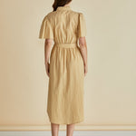 The Immie Dress combines relaxed elegance with timeless appeal. Featuring a stand collar, button-up front and elasticated waistband, it creates a flattering yet comfortable shape. The curved hem and self-fabric waist tie add soft sophistication. An effortless transeasonal piece that feels classic and elevated.