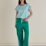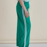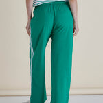 These wide-leg joggers in cotton jersey blend offer a refined approach to casualwear with elasticated waistband and contrast trim detailing. The mid-high rise and relaxed fit create a polished yet comfortable silhouette ideal for transeasonal layering.