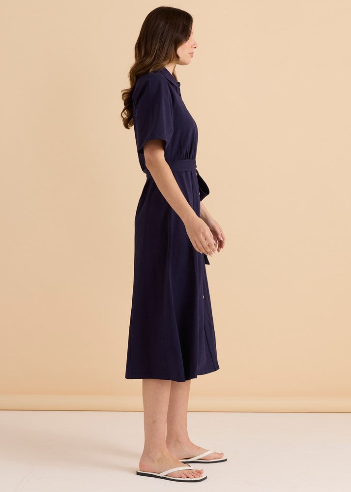 A comfortable stretch shirt dress designed for easy wear. The button-through front and waist tie allow adjustable shaping. Short sleeves make it perfect for everyday styling. A relaxed and polished wardrobe favourite.
