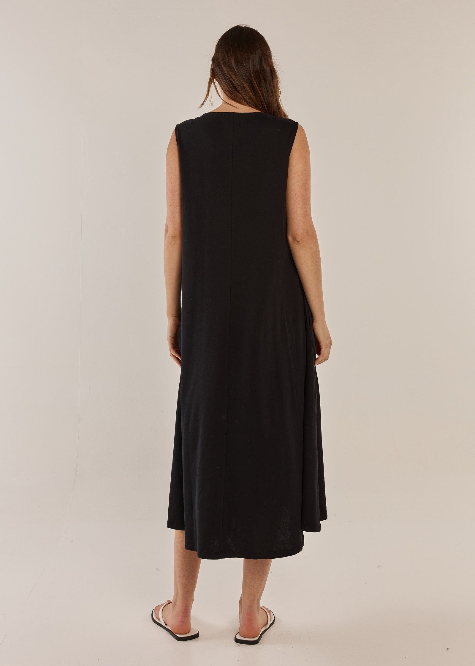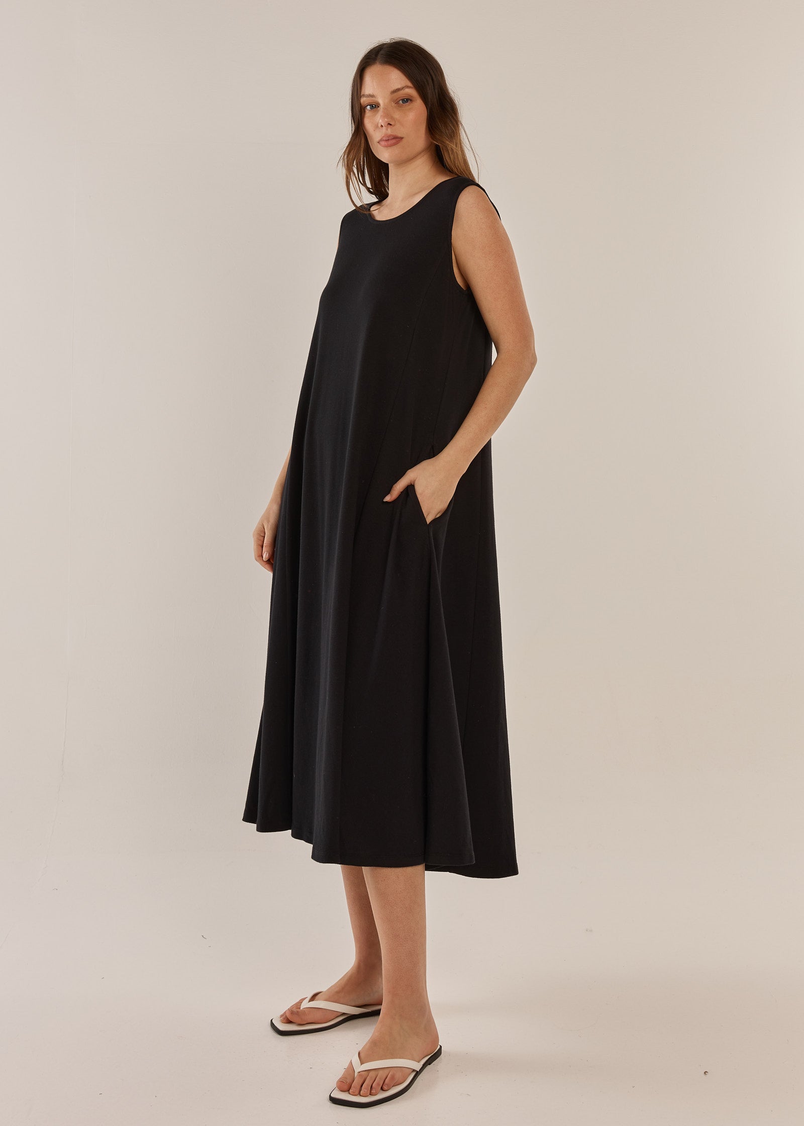 The Sabrina Maxi Dress offers relaxed comfort with soft cotton jersey fabric and a flattering scoop neckline. Sleeveless design and maxi length provide an effortless, elevated silhouette. A classic, comfortable piece ideal for transeasonal layering or standalone wear.
