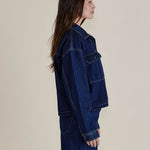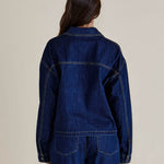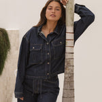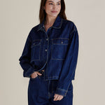 The Selby Denim Jacket is a classic, polished layering piece with a collar neckline and button-up front. Its relaxed fit and straight hemline offer an elevated, timeless look perfect for transeasonal styling.