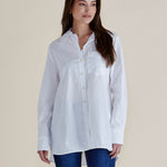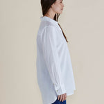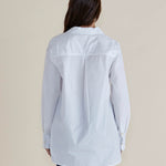 The Shellie Poplin Shirt is a classic, refined piece with a shirt collar, chest patch pocket, and button-up front. Its curved hem and relaxed fit make it perfect for polished layering.