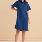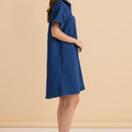 A classic denim shirt dress with a modern A-line shape. The polo-style collar and pockets bring effortless utility. Comfortable and relaxed for easy everyday wear. A transeasonal wardrobe staple with elevated simplicity.