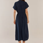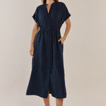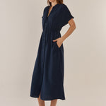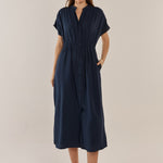 Crafted from a viscose blend, the Simone Dress offers a classic stand collar with V-neck button-up opening. Its comfortable elasticated waistband and cap sleeves create an elevated yet easy fit. A sophisticated dress designed for effortless transeasonal wear.