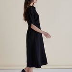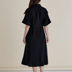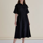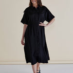 The Skye Dress features a chic button-up front with collar and raglan short sleeves. Its elasticated waist and crinkle texture create a classic, elevated silhouette that’s perfect for sophisticated, transeasonal wear.